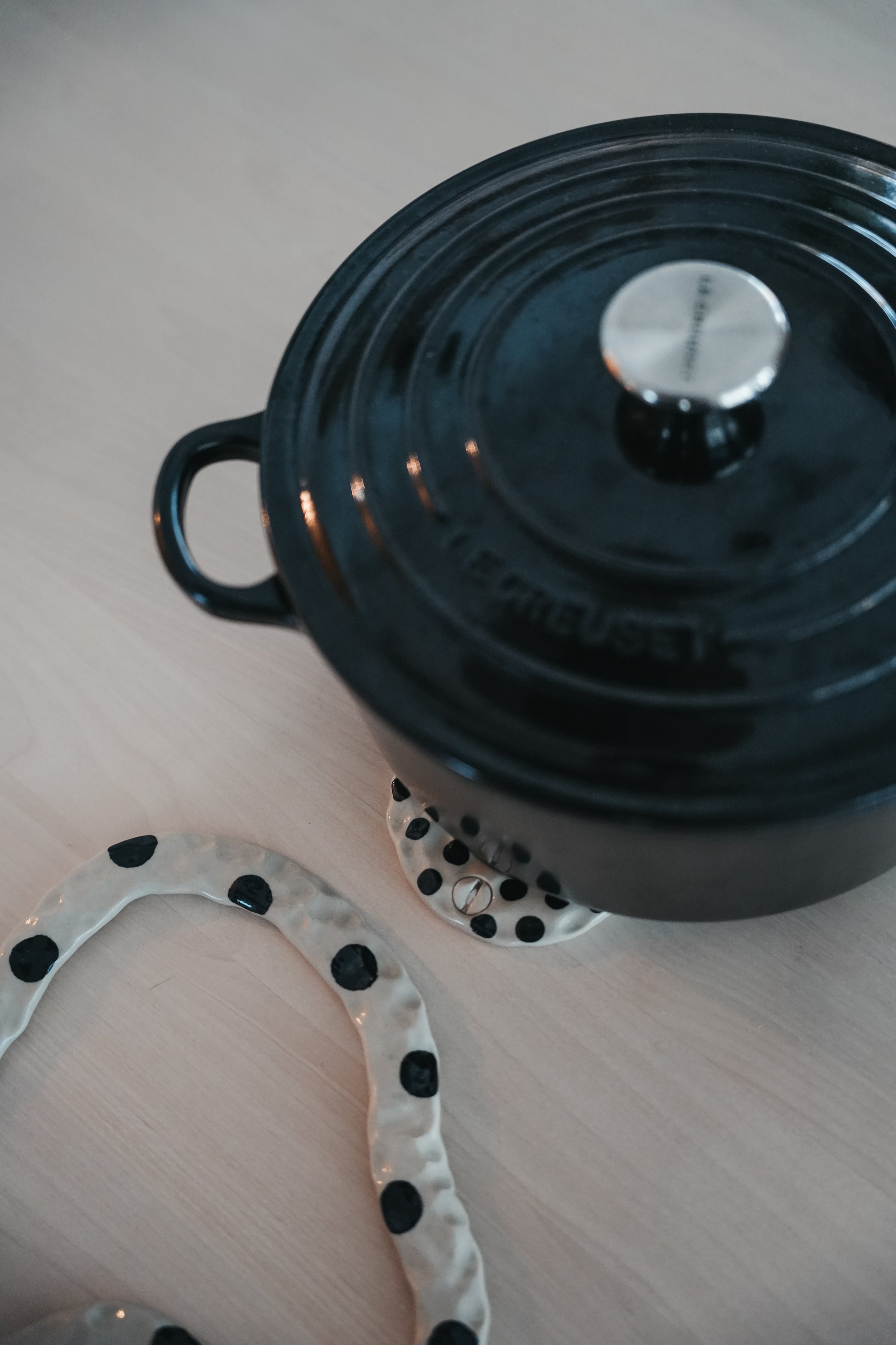 Skulpterat grytunderlägg i stengodslera.