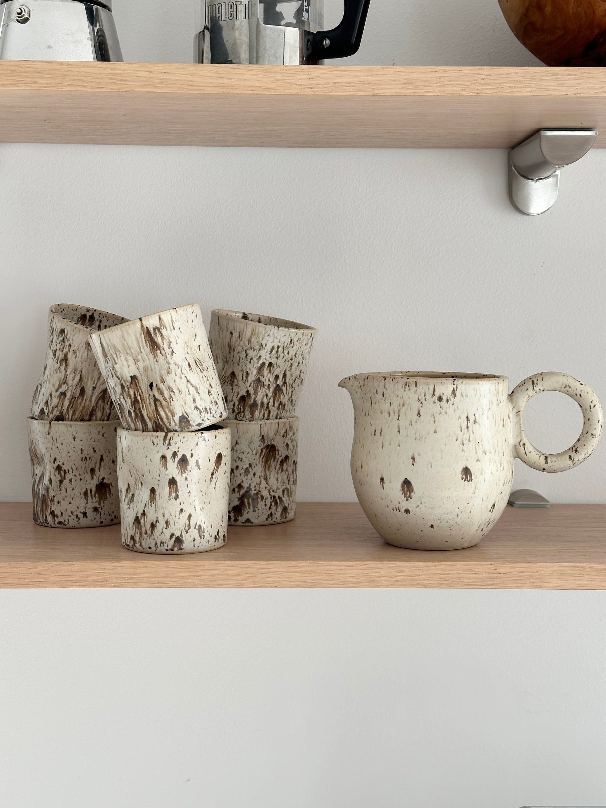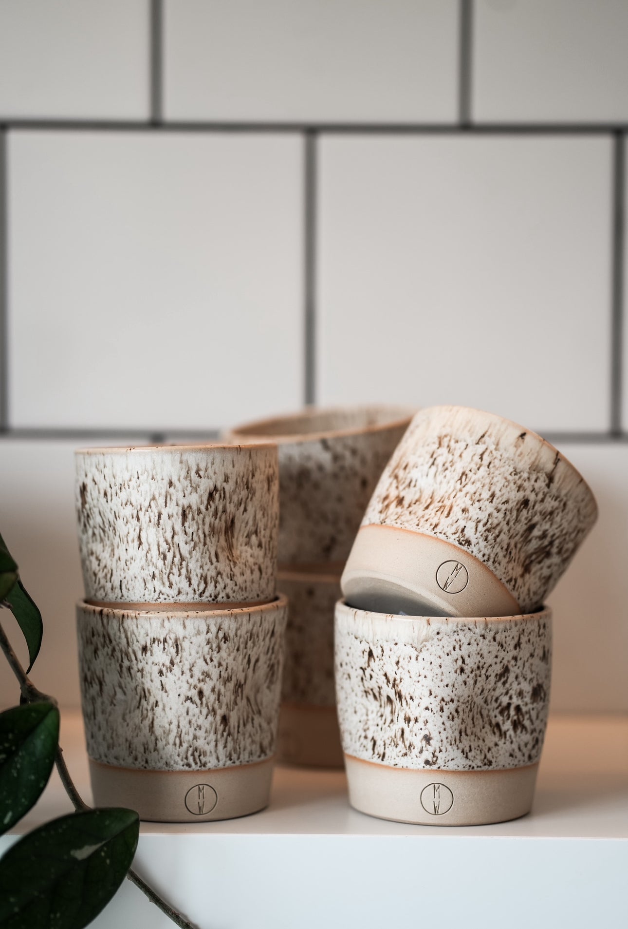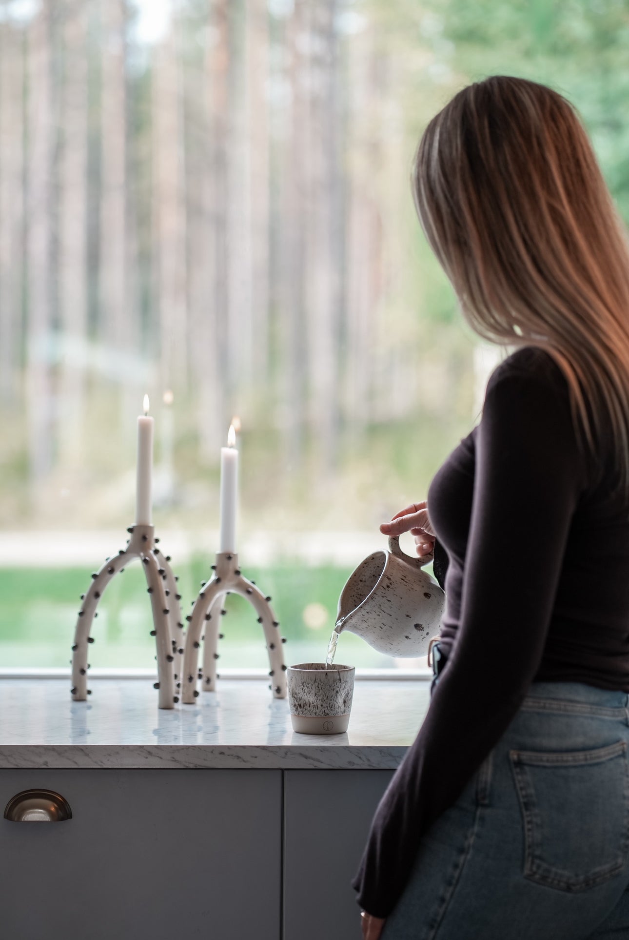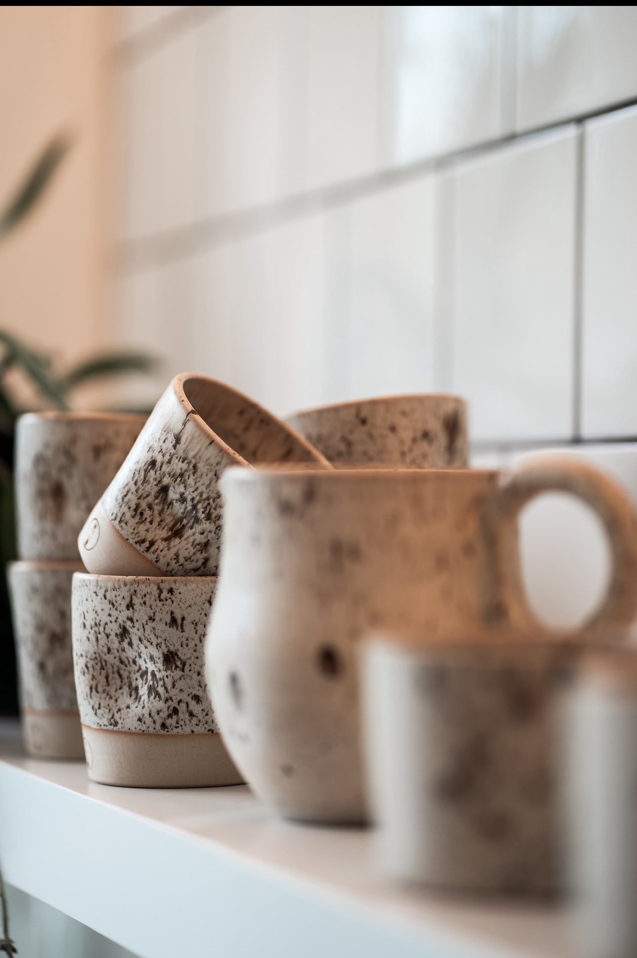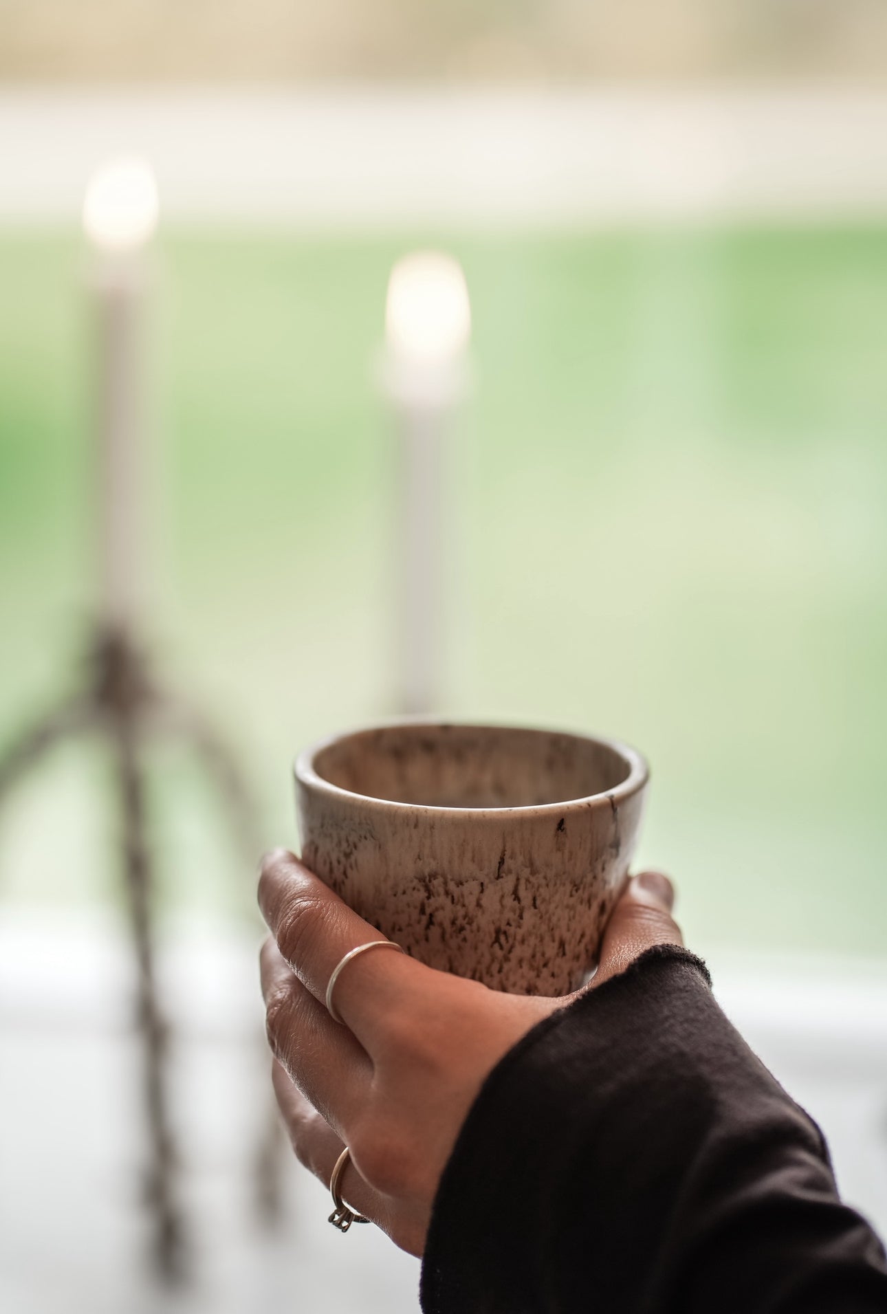 Drejad mugg i stengodslera. Fyra gropar för ökad komfort i handen.