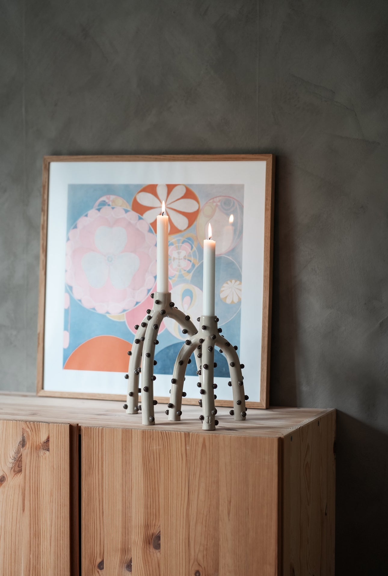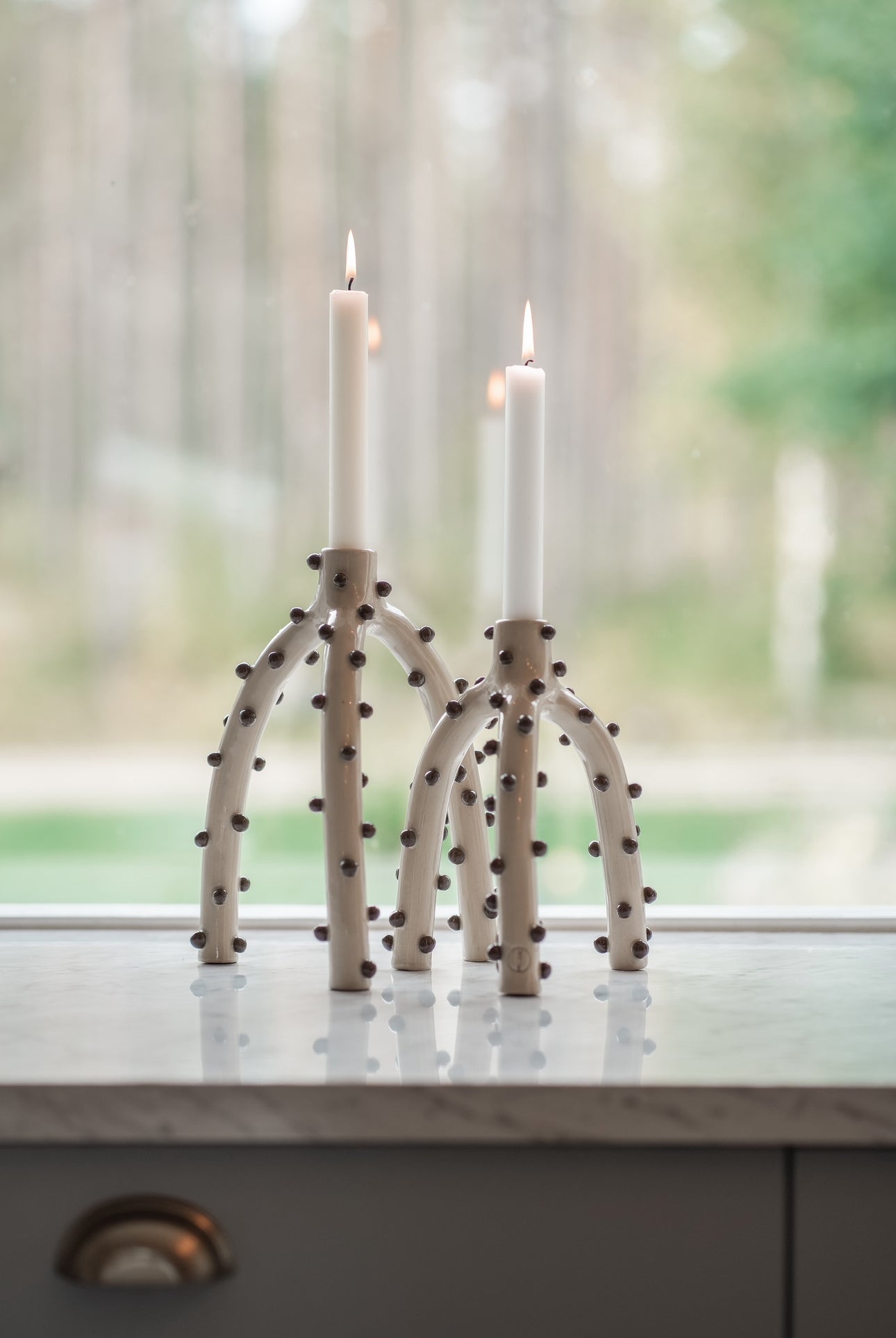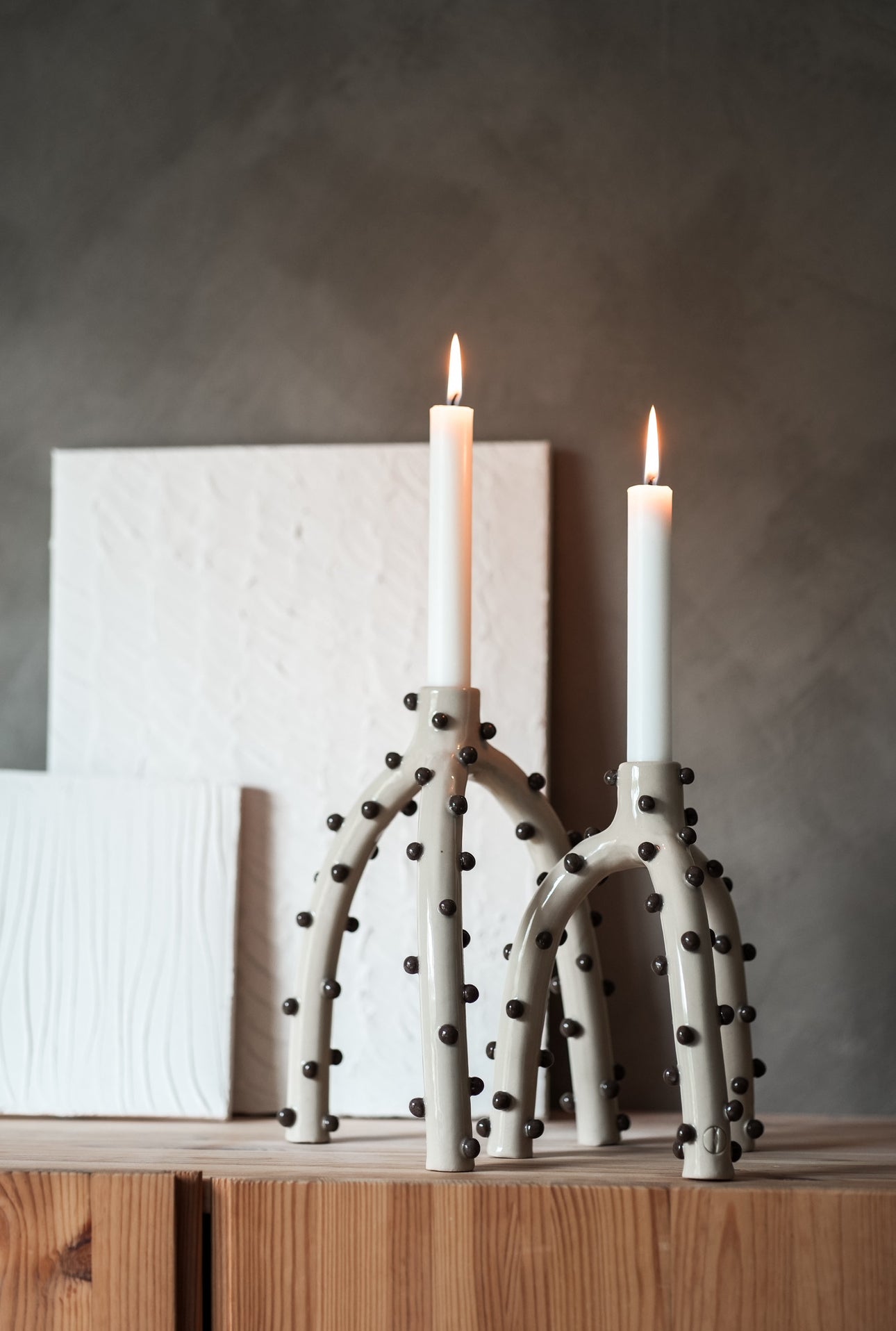 Skulpterad ljusstake i stengodslera med mörkbruna bollar.