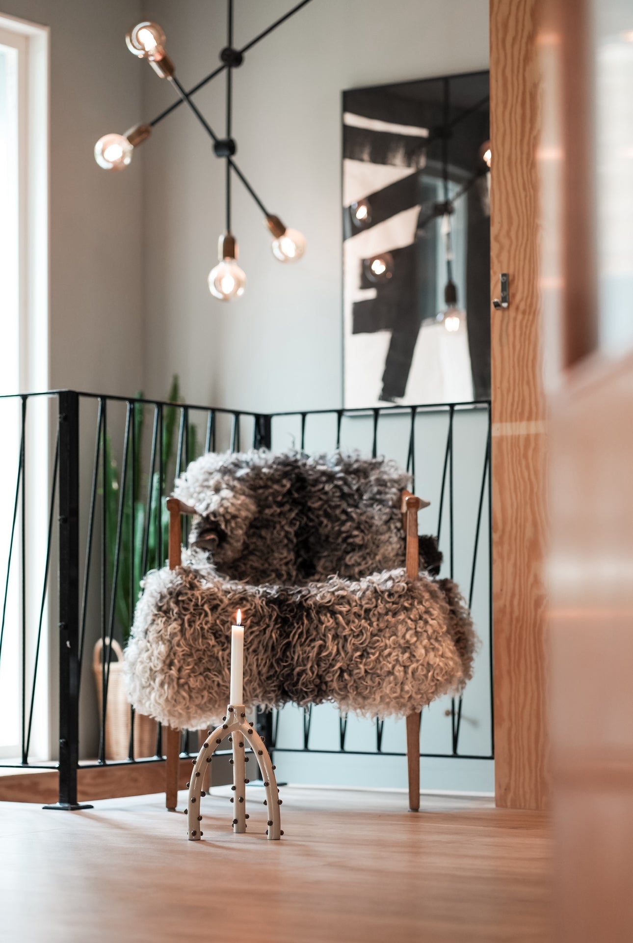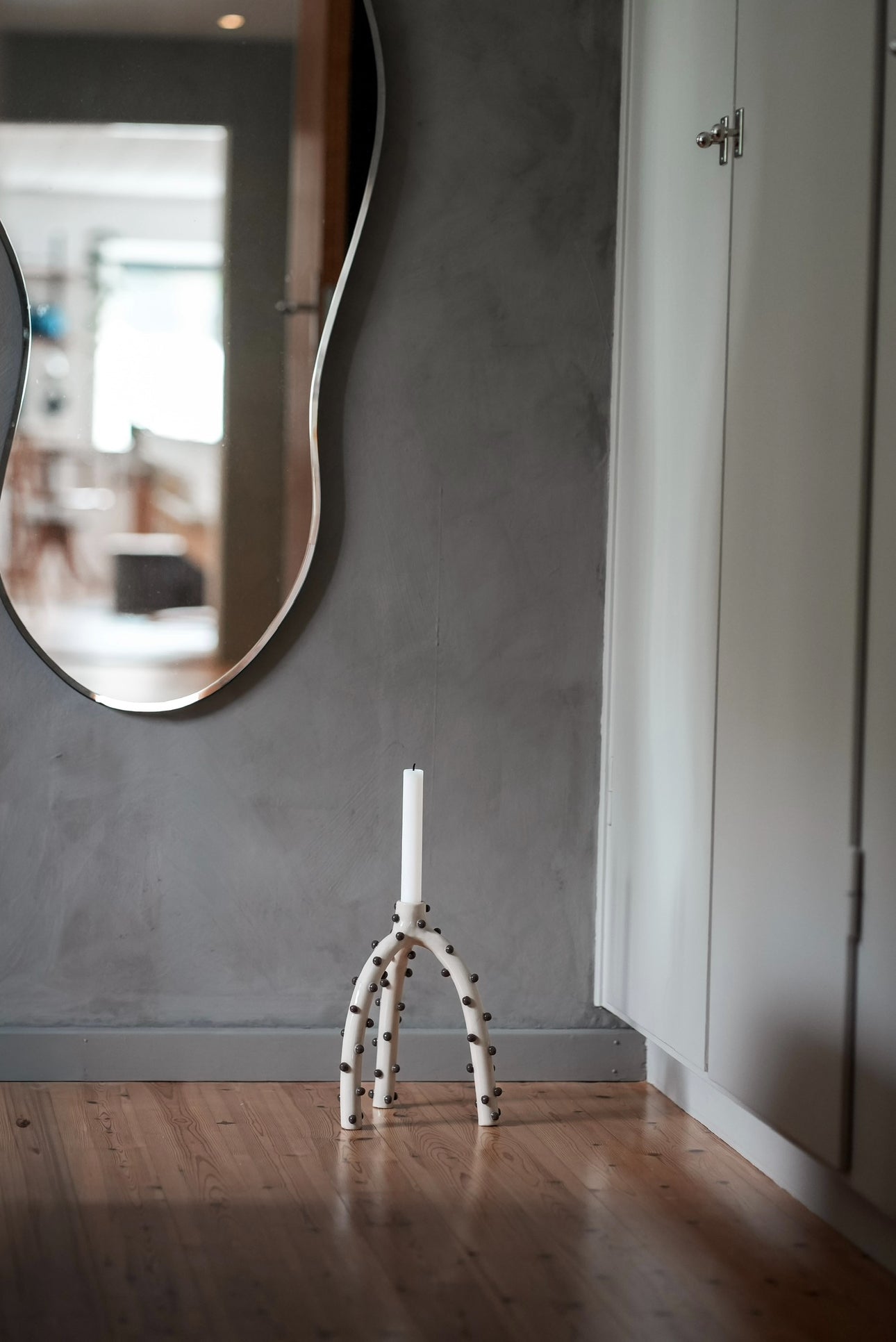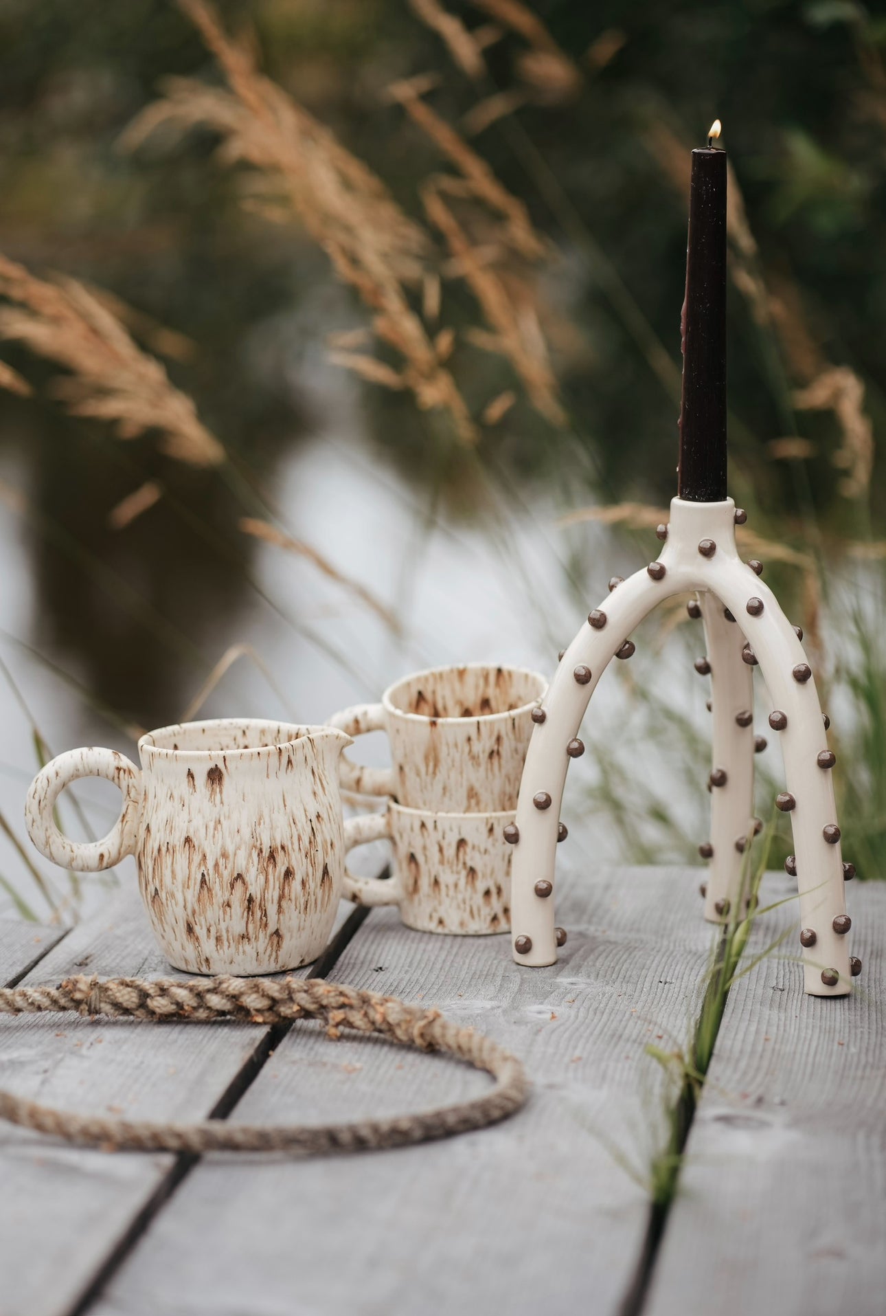 Skulpterad ljusstake i stengodslera med mörkbruna bollar.