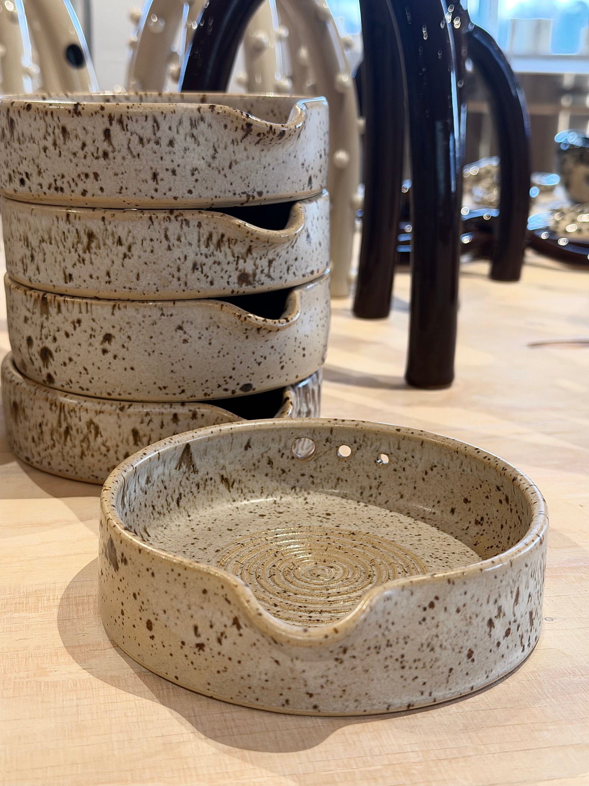 Drejat spillkum med rivfunktion i botten samt små hål i bakkant där du enkelt repar färsk kryddor (repa kryddan i motsatt riktning). Funkar även utmärkt som slevat.