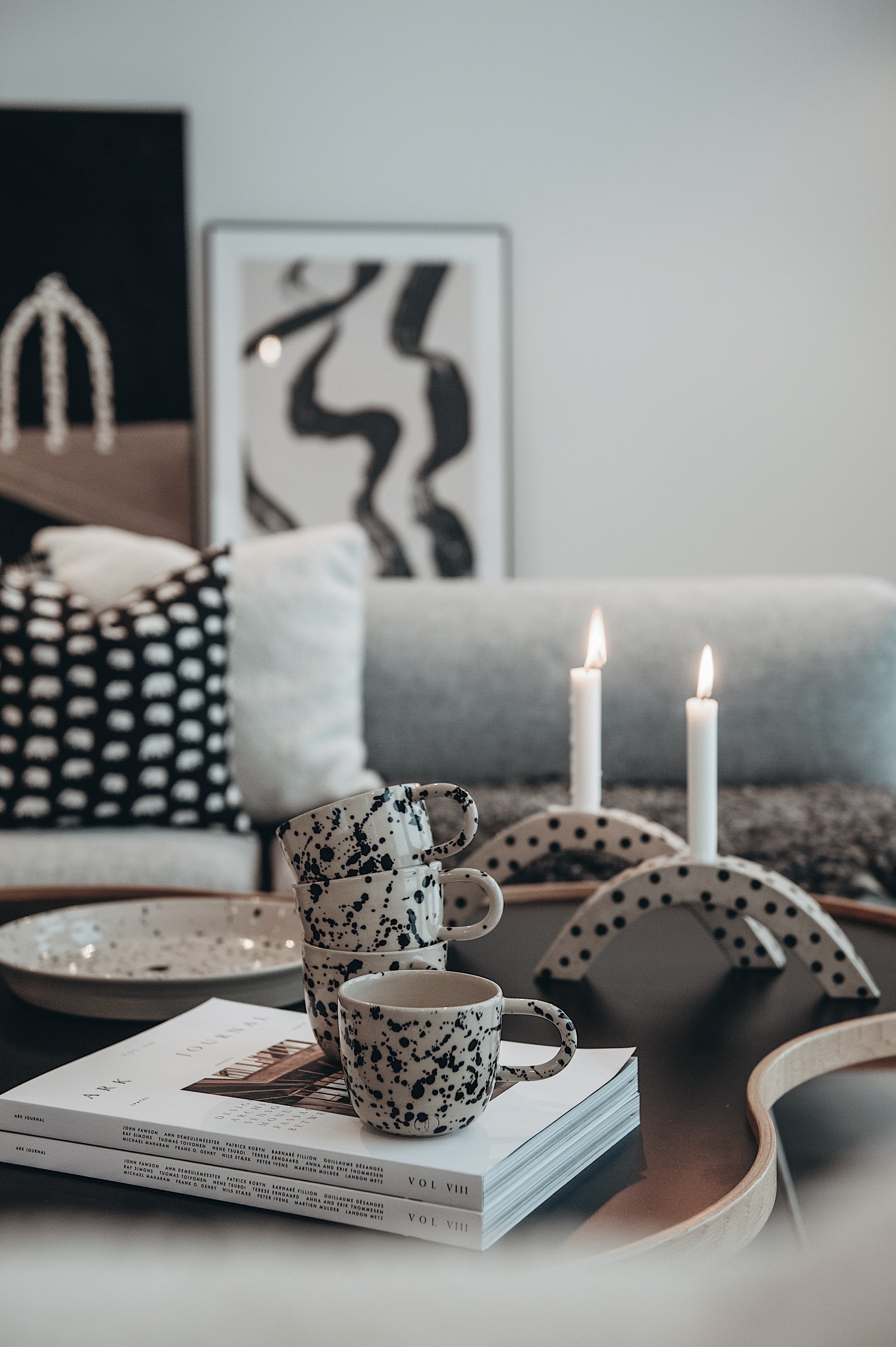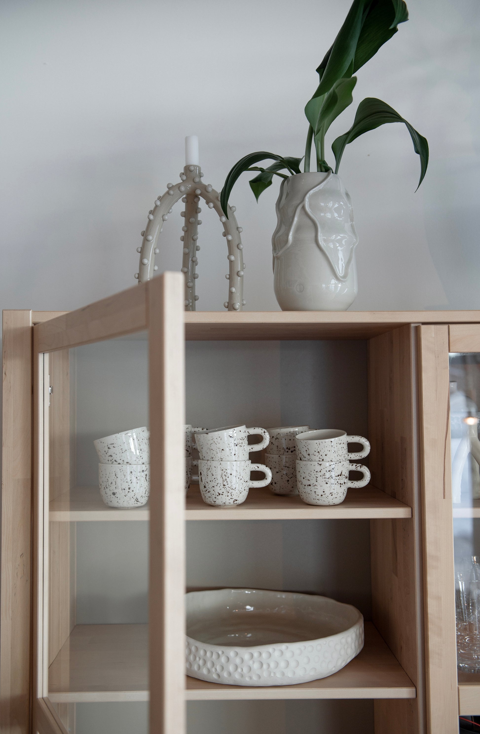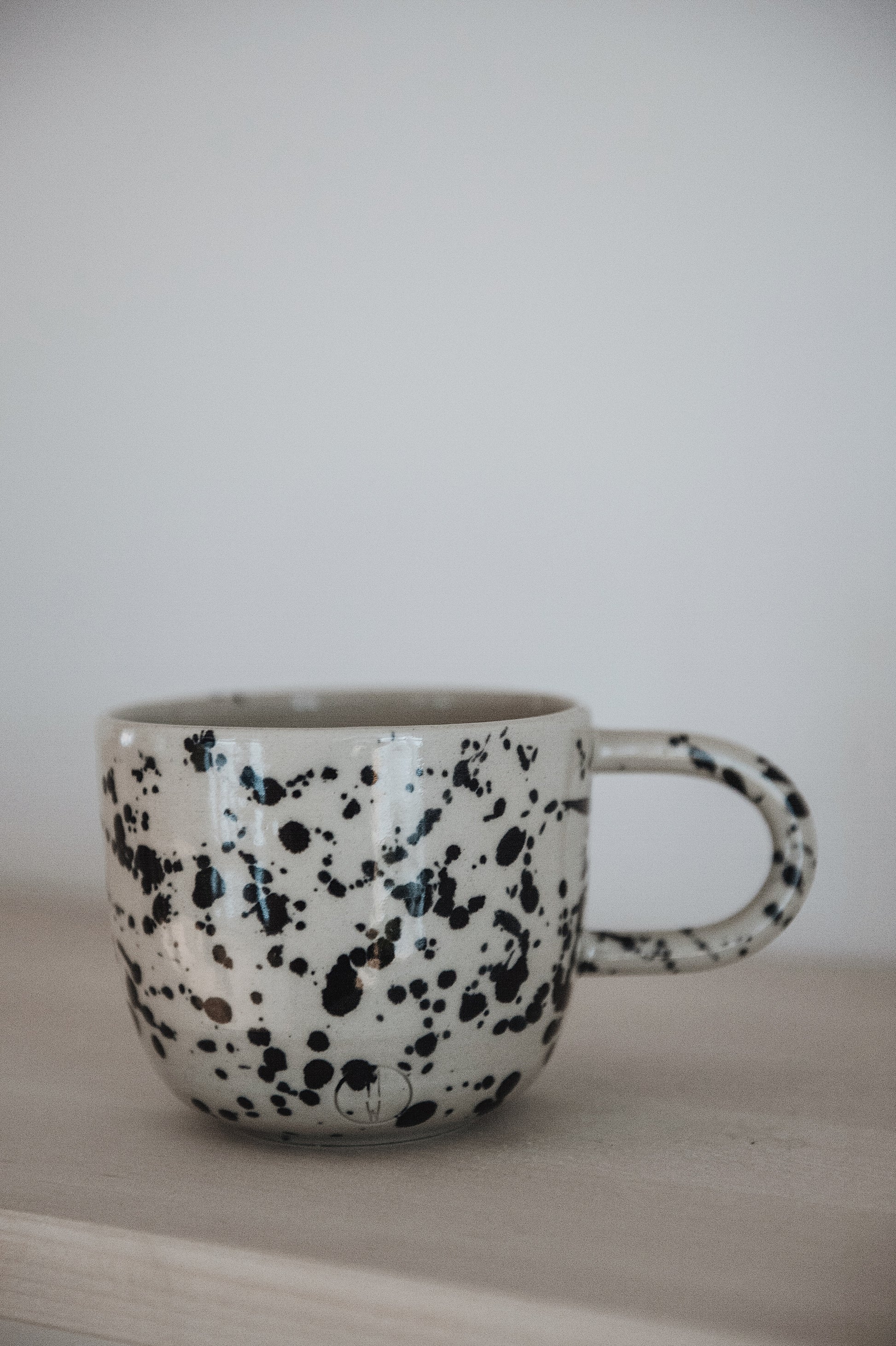 Turned mug in stoneware clay with black splash on the outside. Microwave and dishwasher safe.