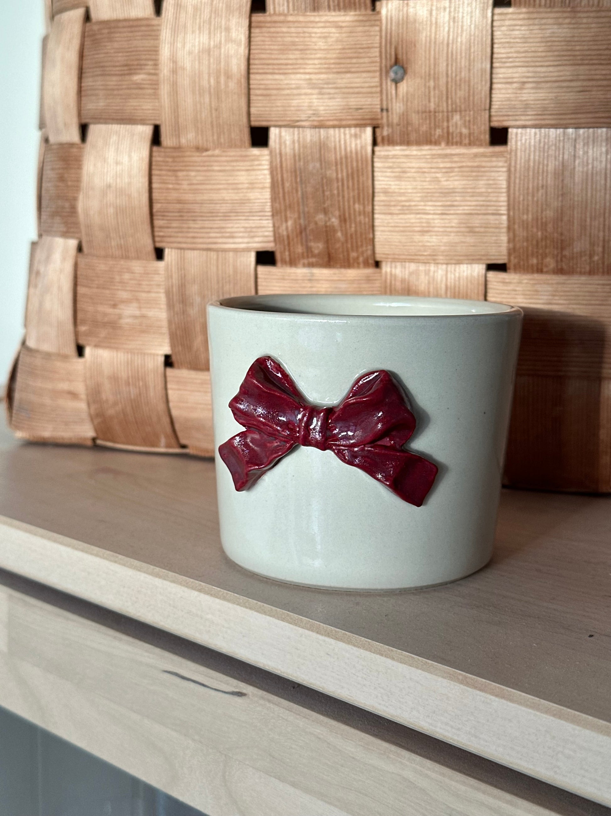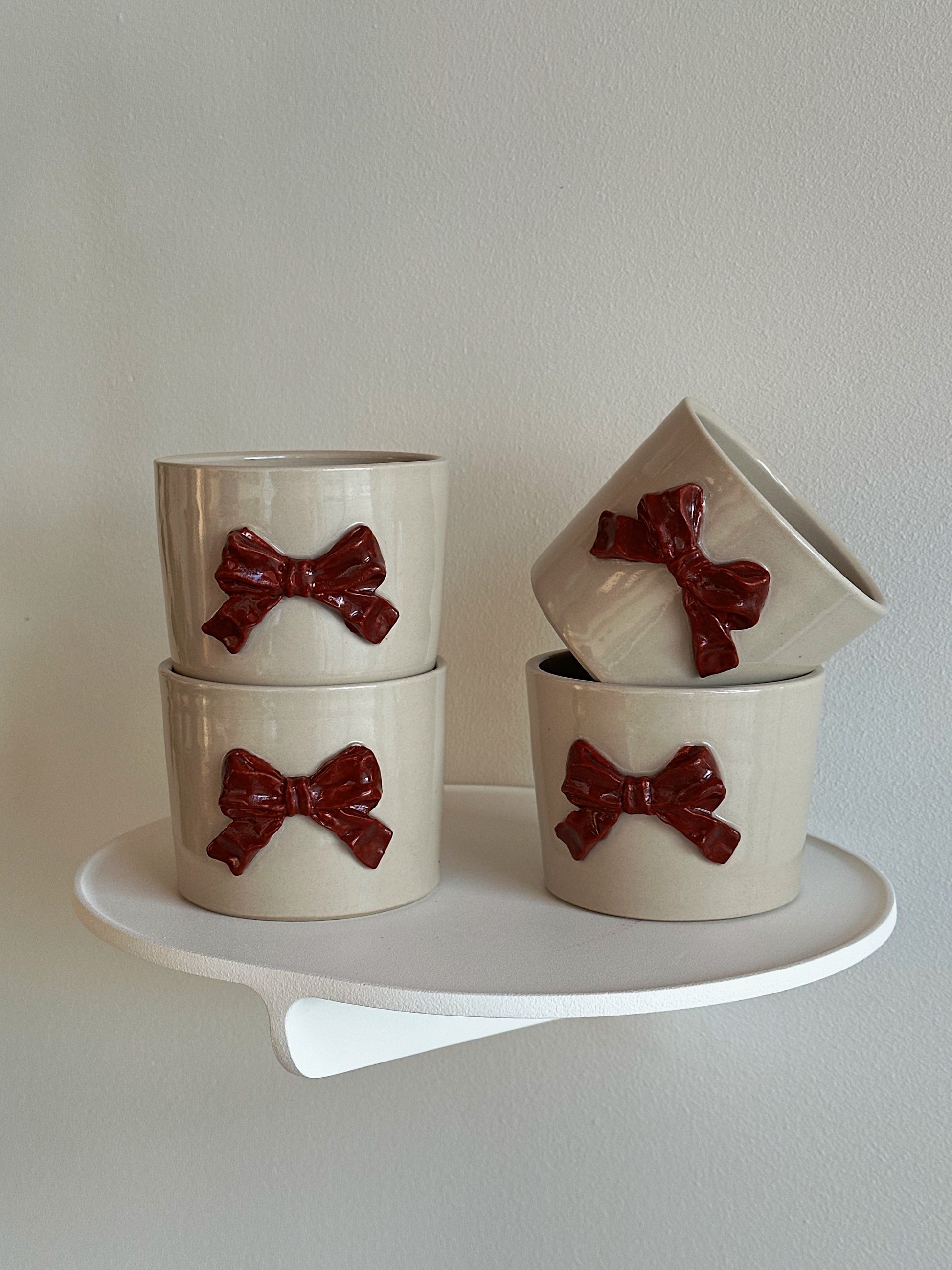 Drejad mugg/skål i stengodslera. Dekorerad med rosett i brun lera.