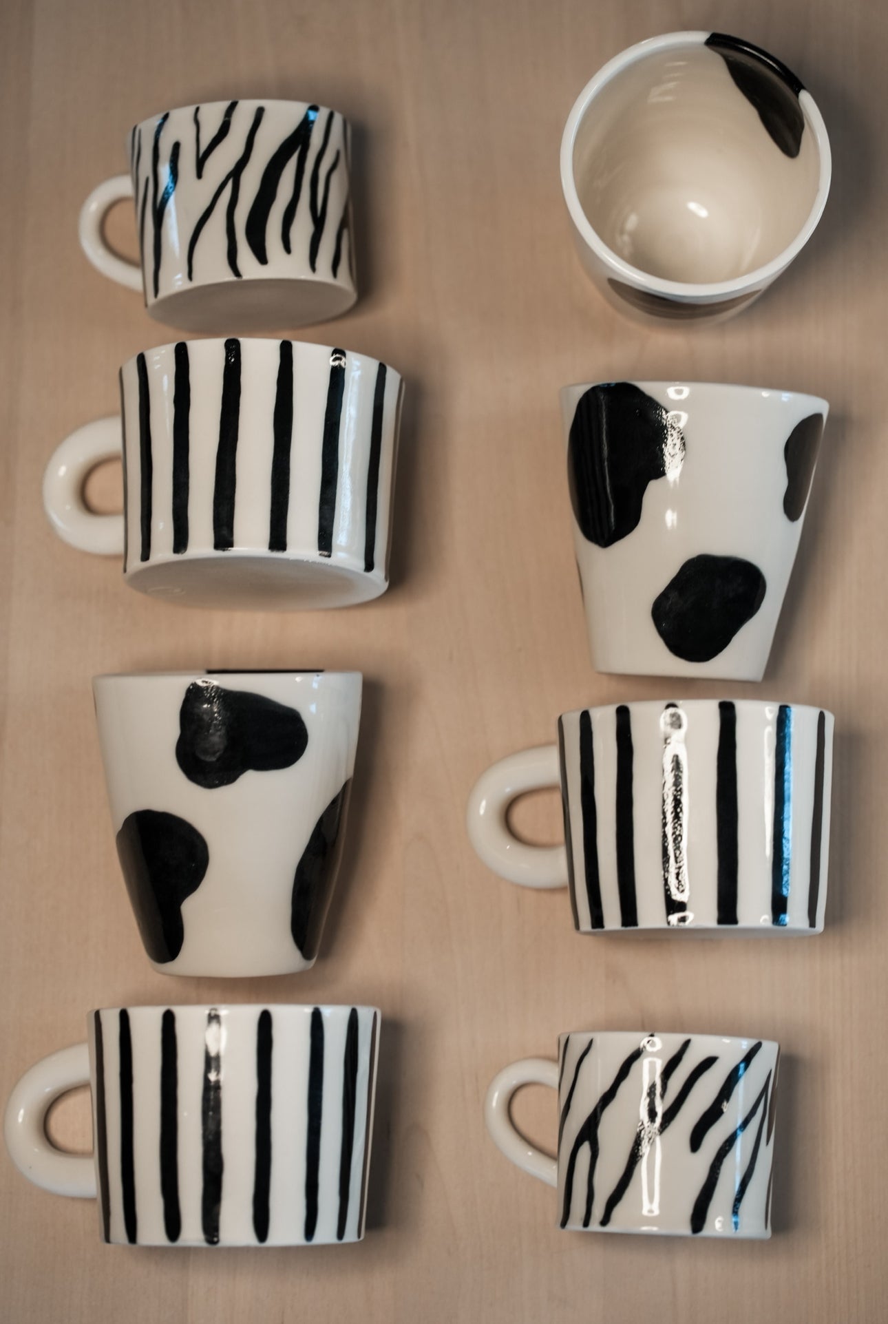 Drejad mugg i porslinslera. Handmålat mönster inspirerat av korasen svensk låglandsboskap.