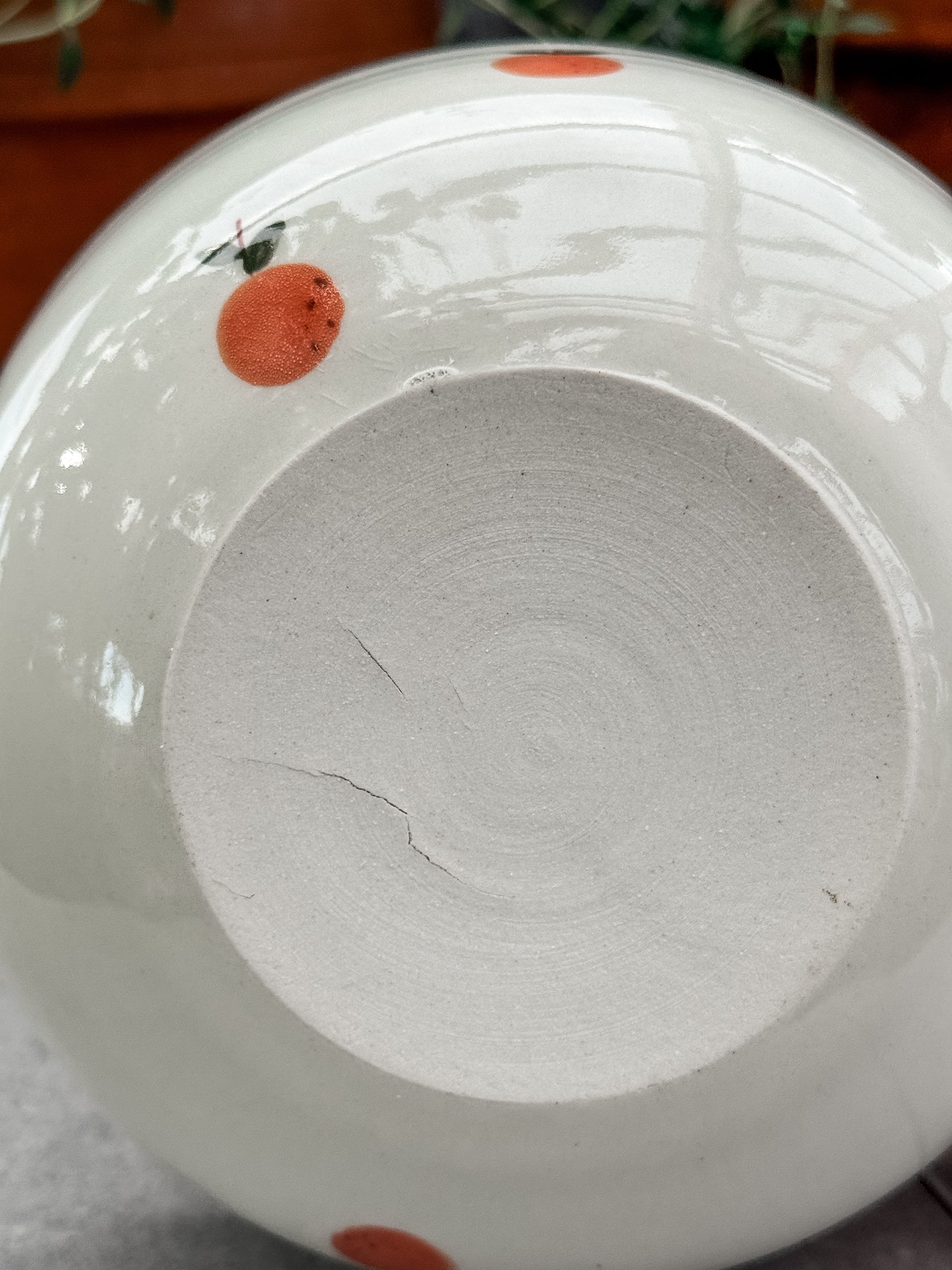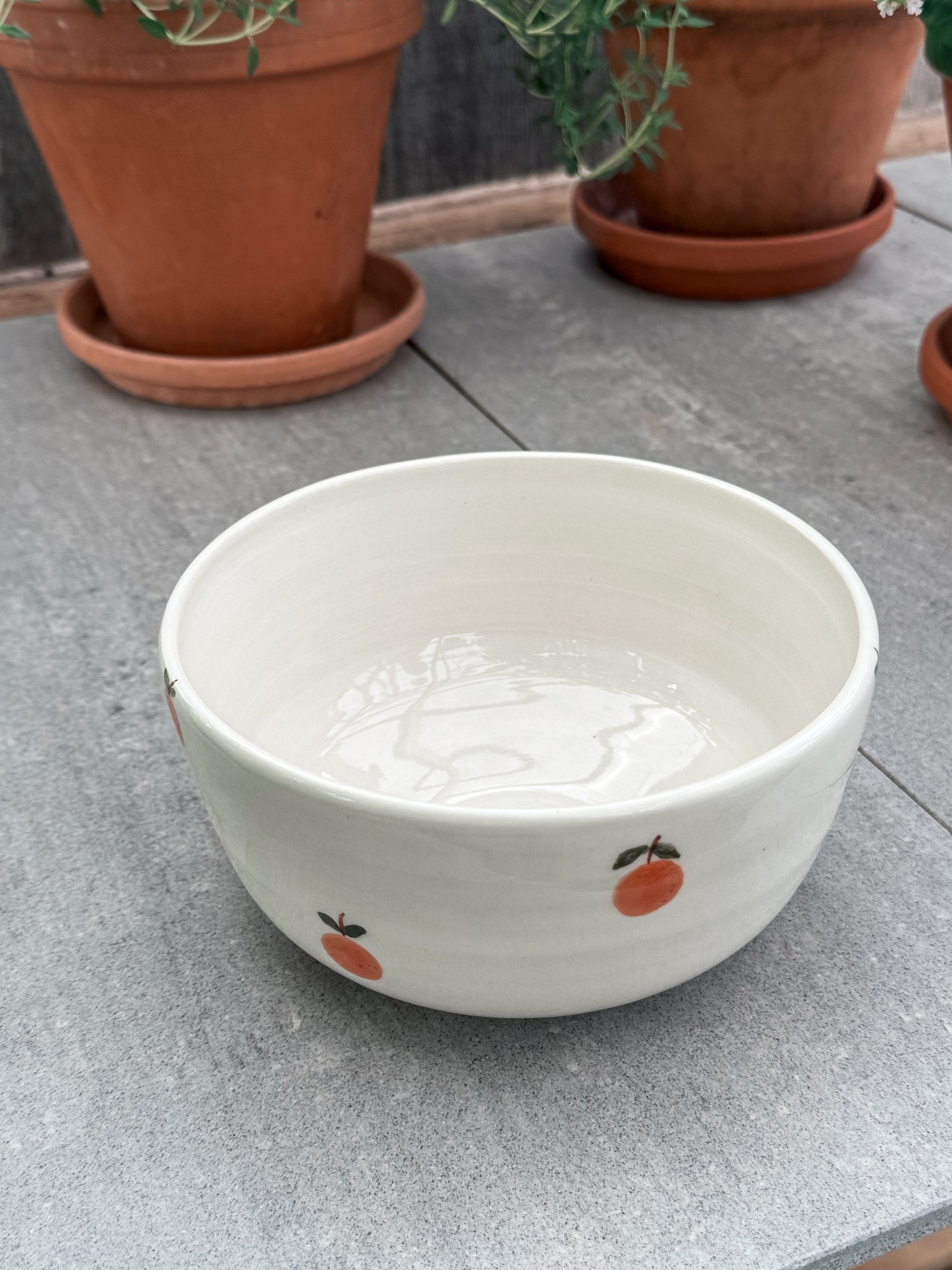 Drejad skål i porslins-/stengodslera. Handmålade apelsiner.