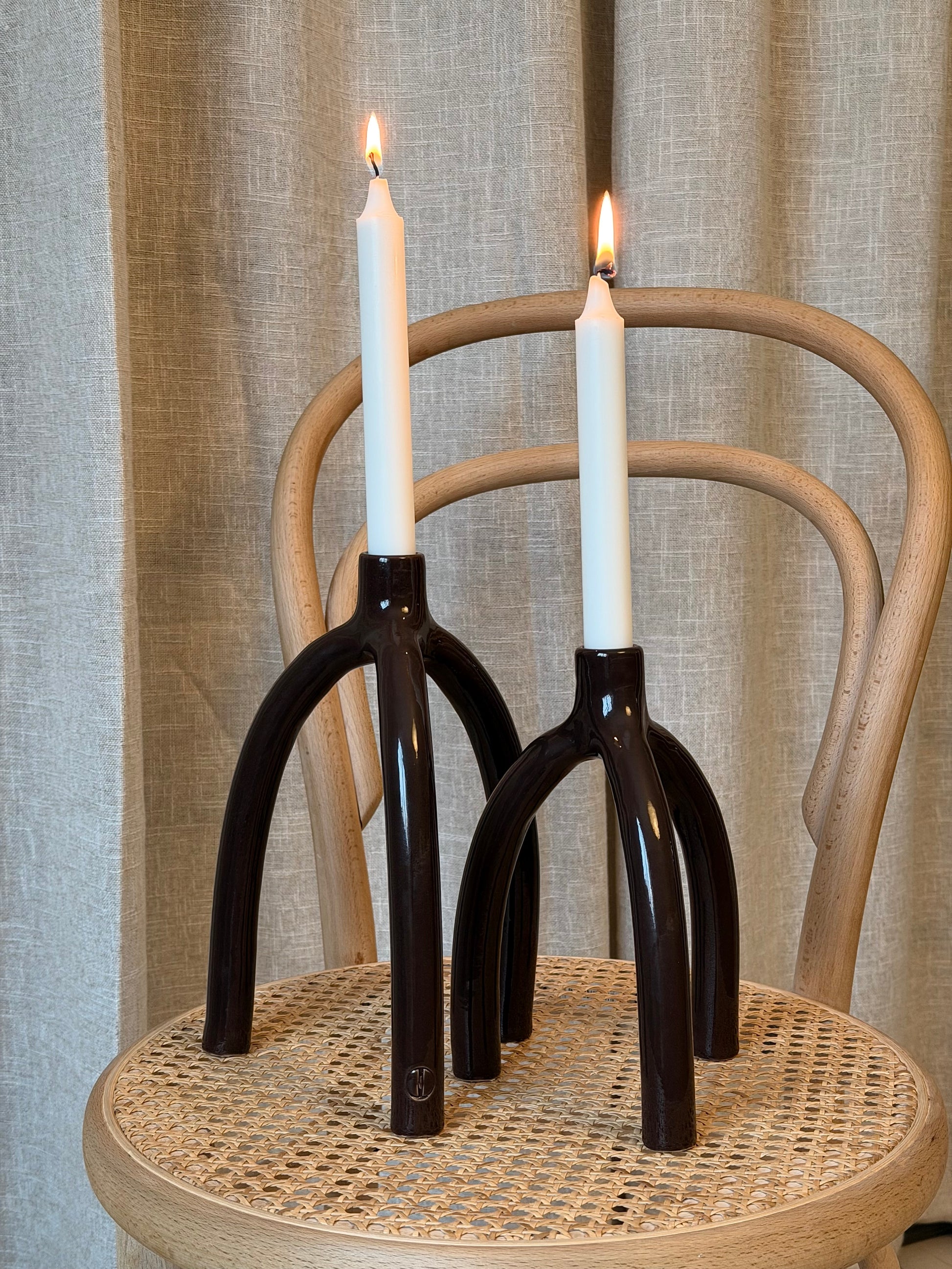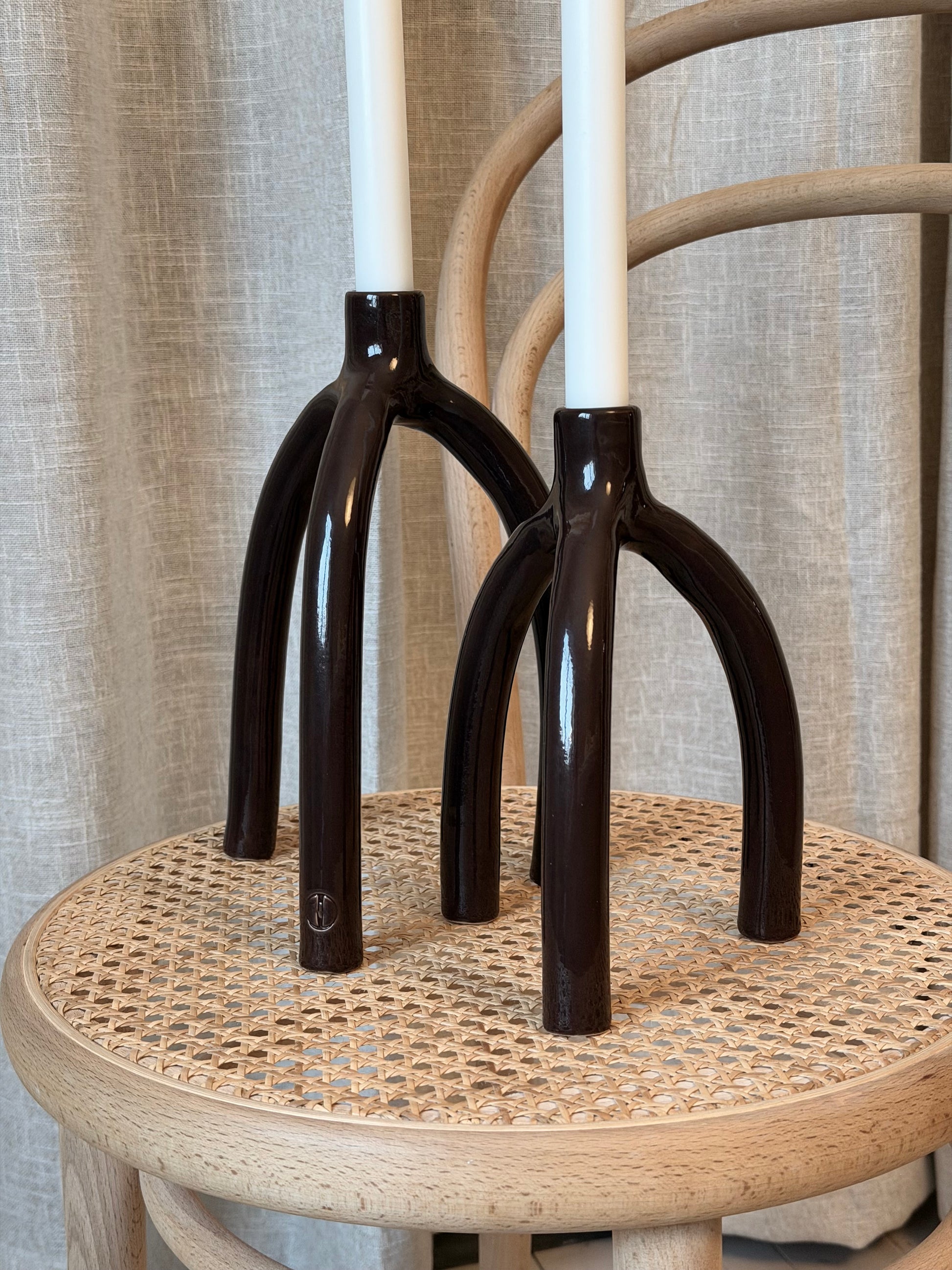 Drejad och skulpterad ljusstake i stengodslera. Penslad med en chokladbrun glasyr.