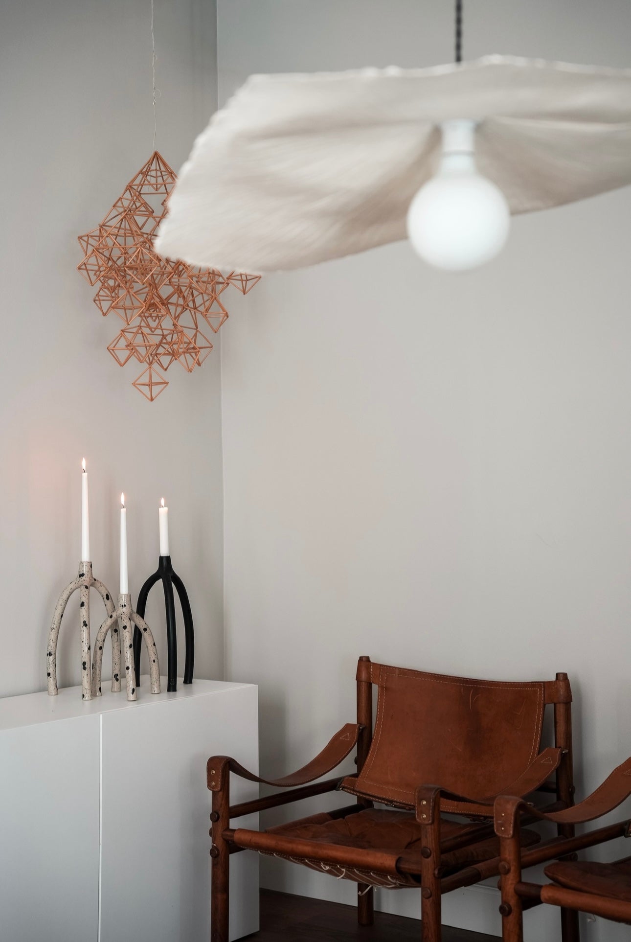 Skulpterad ljusstake i stengods med handmålade fläckar och stänk.