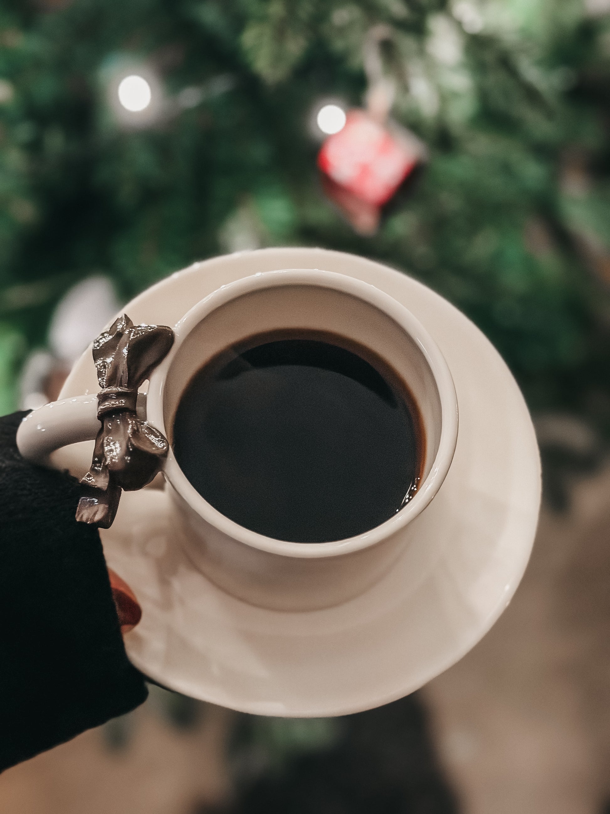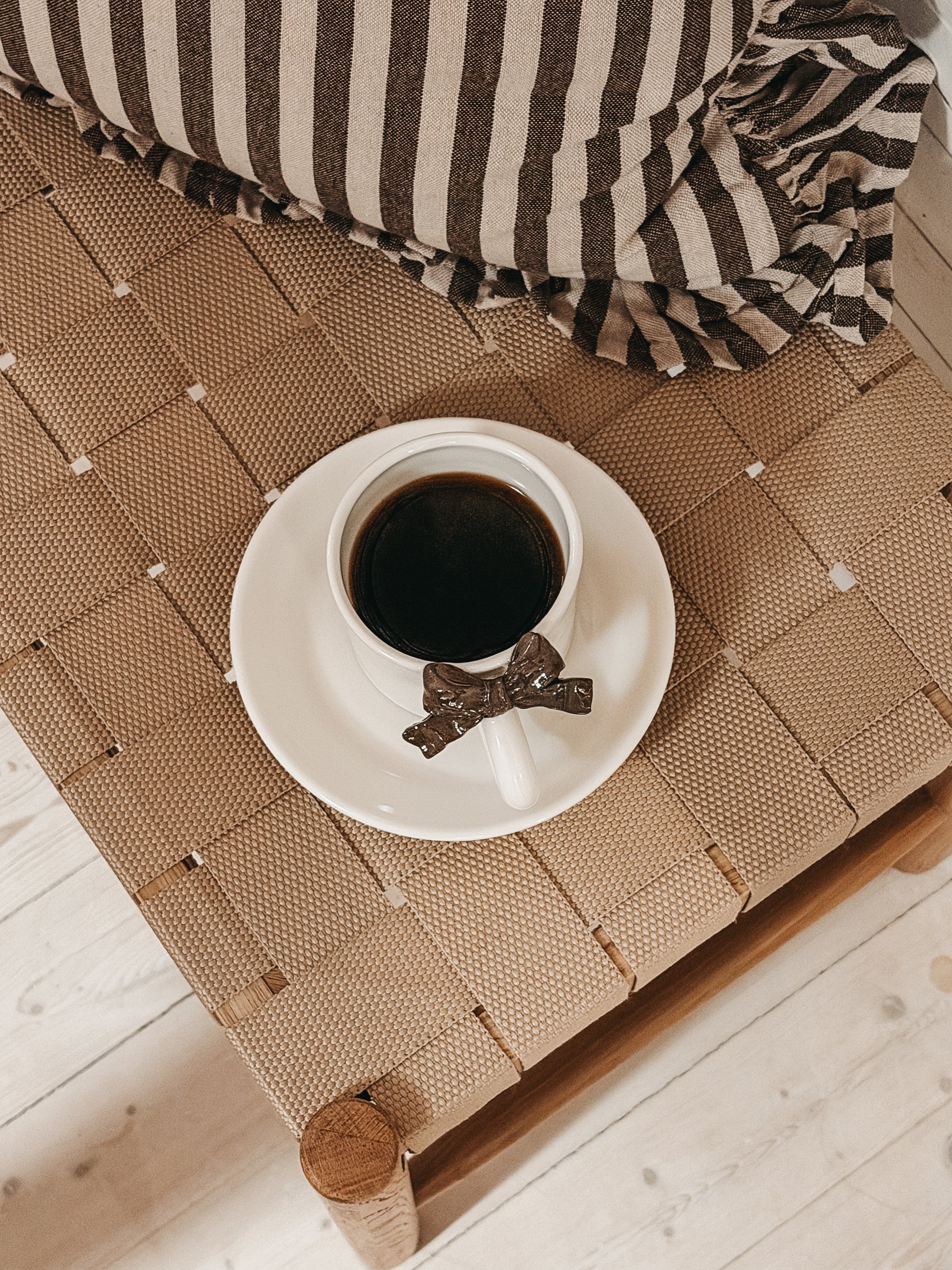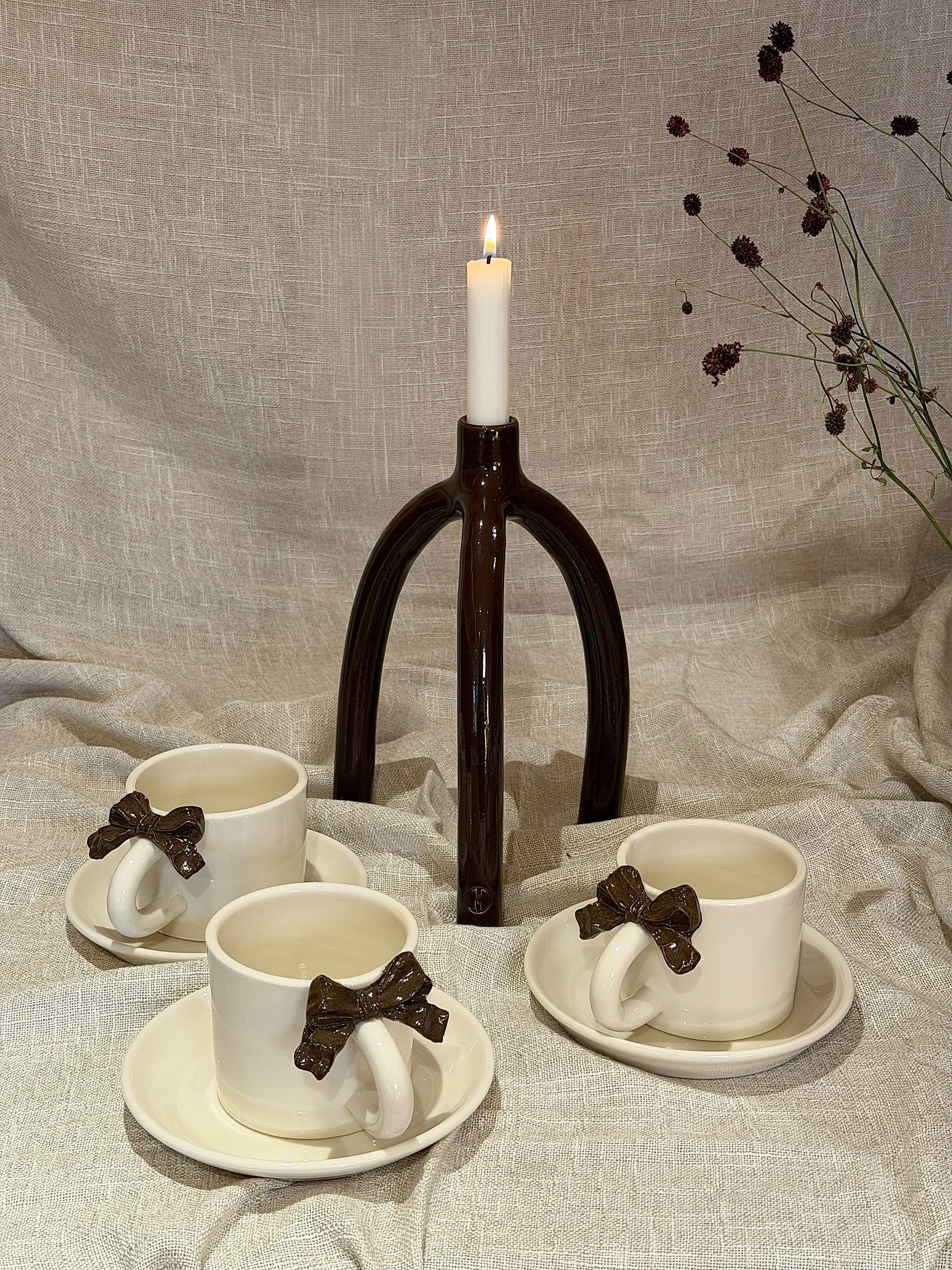 Drejad mugg i porslinslera. Brun dekorativ rosett på handtaget.