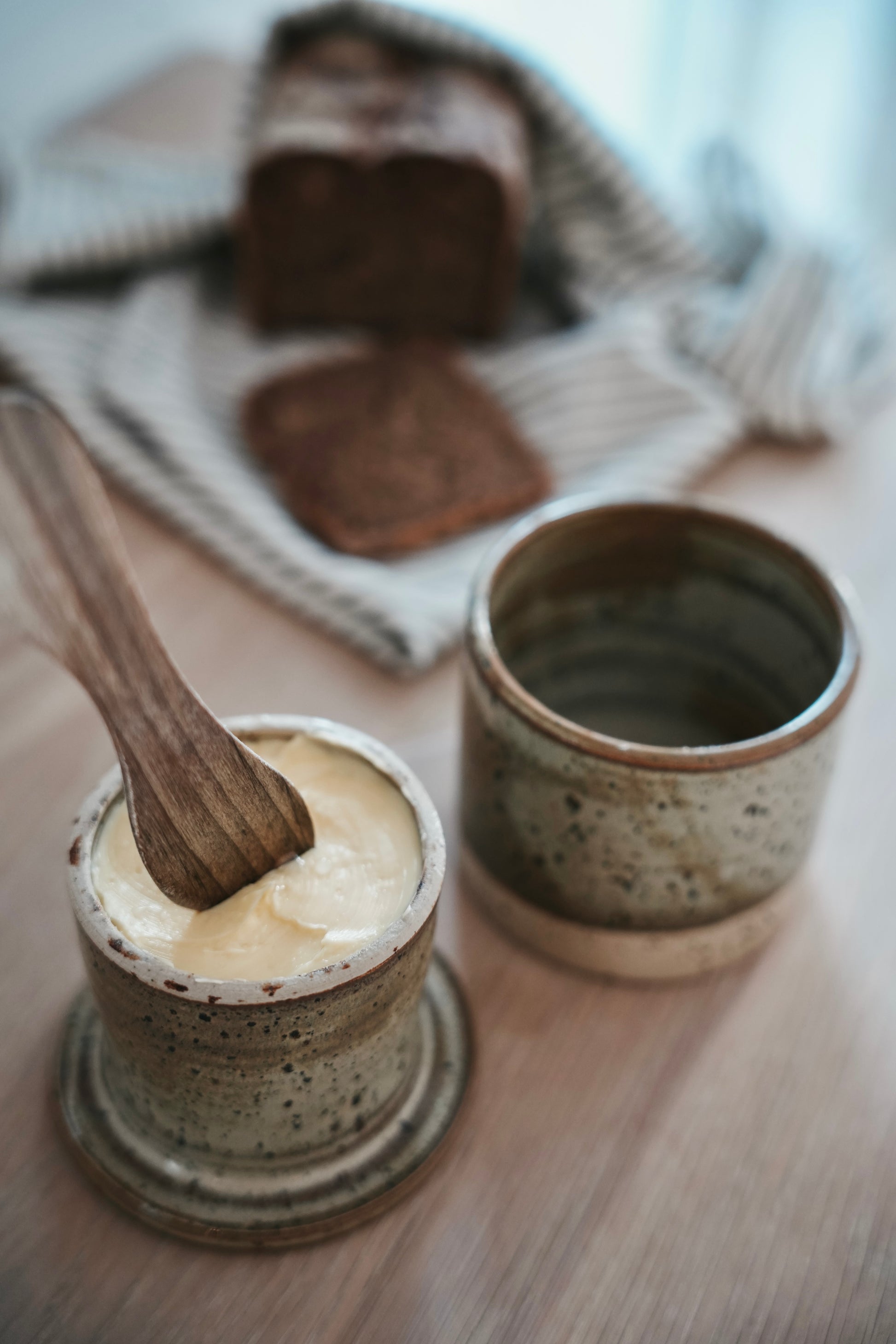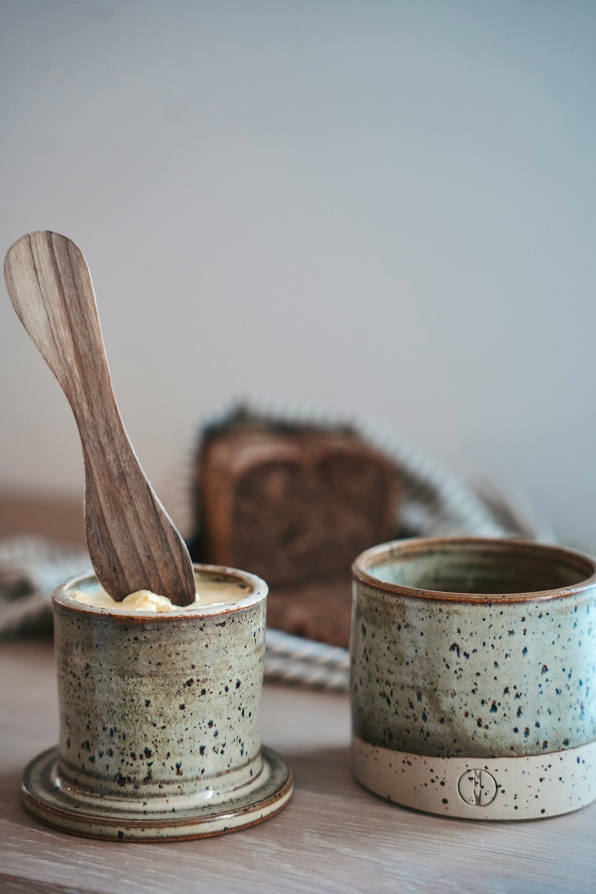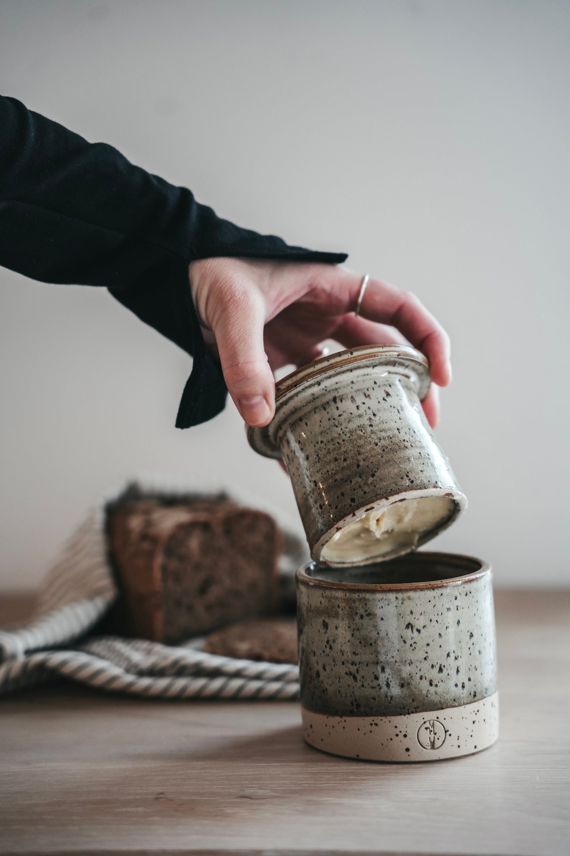 Drejad smörklocka i stengodslera. Fyll smörklockan med smör och andra delen med någon centimeter vatten så har du en syretät anordning och kan förvara ditt smör i rumstemperatur.